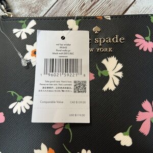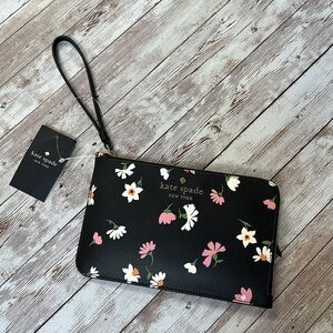NWT Kate Spade New York Lucy Floral Waltz medium L-zip wristlet. Black with floral print. Gold hardware.
