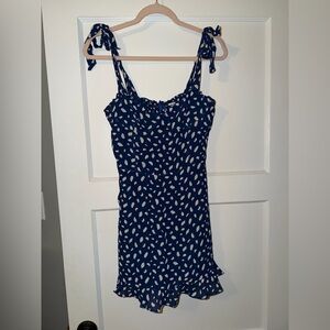 Chic mini dress with navy base and white pattern. Features tie straps and ruffled hem.
