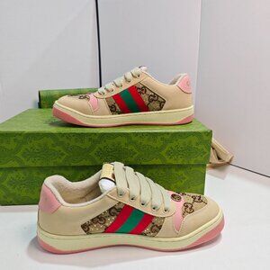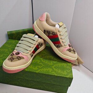 Step into luxury with these Gucci Screener sneakers, where classic style meets contemporary flair. Crafted from premium leather and featuring the iconic GG canvas, these sneakers are adorned with sparkling crystal embellishments for an added touch of glamour. The vibrant pink accents on the heel and sole bring a playful pop of color, making these sneakers a standout choice for any casual ensemble. Perfect for fashion enthusiasts seeking both comfort and high-end style.