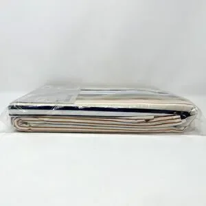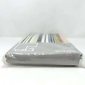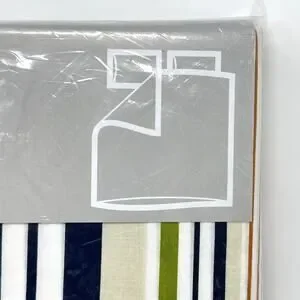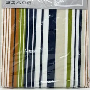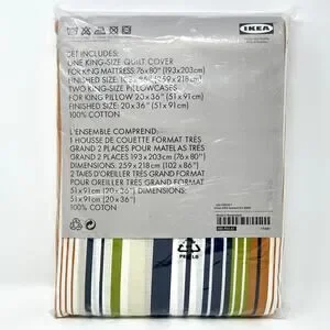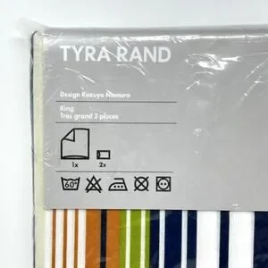 Enhance your bedroom decor with this stylish IKEA TYRA RAND King Size Duvet Cover Set. Featuring a vibrant striped pattern in navy blue, olive green, rust orange, and light beige on a crisp white background, this set brings a fresh, modern aesthetic to any room. Crafted from 100% cotton, it offers a soft, breathable, and comfortable sleeping experience. The set includes one king-size duvet cover and two king-size pillowcases, perfect for a complete bedding refresh. Easy to care for, this machine washable set is designed for everyday living. New in original packaging.