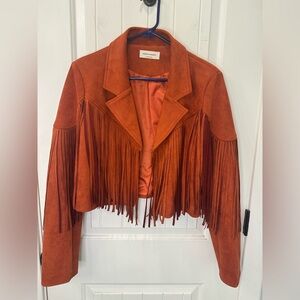 Saints & Hearts Rust Orange Faux Suede Fringe Cropped Jacket Size L Western Boho Title: