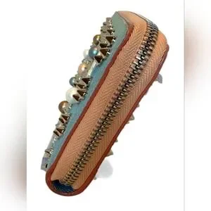 Stylish blue denim zippy wallet adorned with studs and pearls. Perfect for adding a chic touch to any outfit.