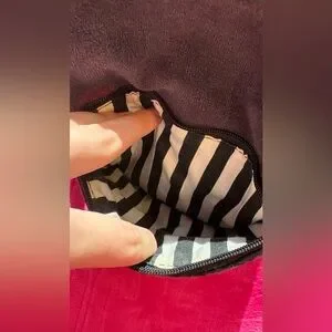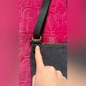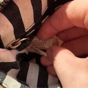This bag does have noticeable peeling/flaking on the faux leather trim ( shown in photos ) especially along the top edge and zipper area (see photos). There is also some light red staining on the front. Zippers work, structure is intact, and interior is clean with the signature Juicy striped lining and tag with the year 2013 on it!