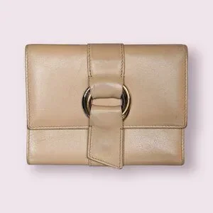 Good pre-owned condition. Exterior leather remains intact with light wear consistent with age and use. Due to the light color, there is some light staining and subtle discoloration from contact with the metal hardware. Interior card slots and bill compartment are clean, with light coin residue inside the coin pocket. All wear is cosmetic; wallet is structurally sound and fully functional. Please review all photos for details.