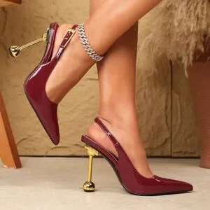 Elegant Burgundy Patent Slingback Heels with Gold Ball Stiletto