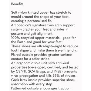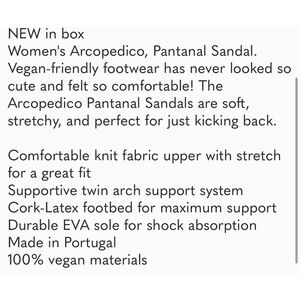 New Arcopedico Pantanal sandals in size 37EU or (US 7-7.5). Black knit fabric upper with crisscross straps. Cork-latex footbed and durable EVA sole. Features a supportive twin arch system and antimicrobial properties. Packaged in original box with tags. Vegan-friendly materials. Made in Portugal.