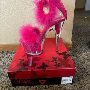 Pleaser Hot Pink Feathered Heels with Silver Accents