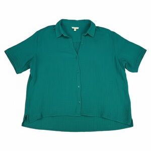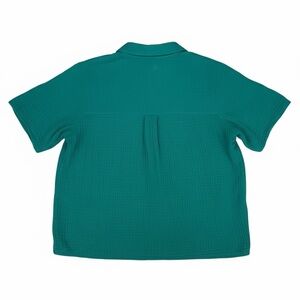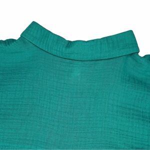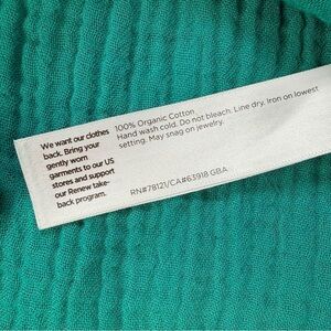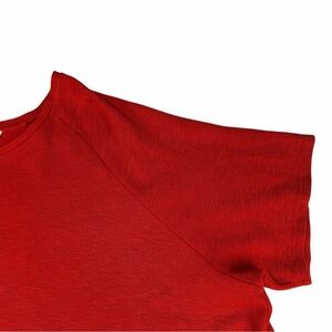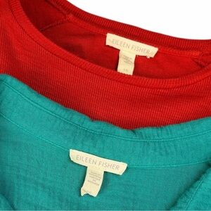 The product is a set of two Eileen Fisher women's short sleeve tops in size large, made from 100% organic cotton. These solid red and green tops feature a relaxed fit with a pullover and button closure, making them ideal for casual occasions. Made from lightweight material, these tops are machine washable and suitable for all seasons. Perfect for those looking for a classic yet stylish addition to their wardrobe, these tops offer comfort and versatility.