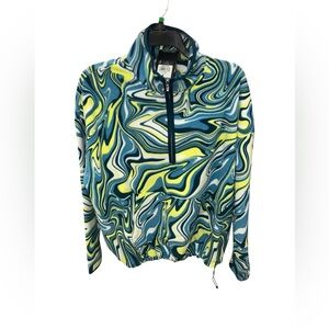 Vibrant active ware jacket featuring a playful blue and green pattern.