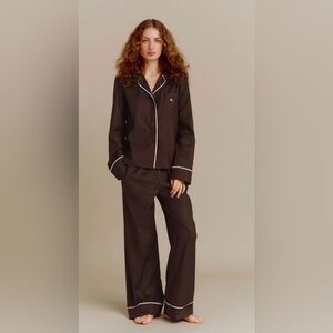 Chic brown pajama set. Features white trim. Button-up top and relaxed pants.