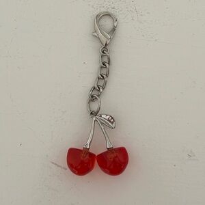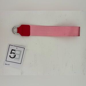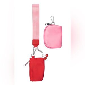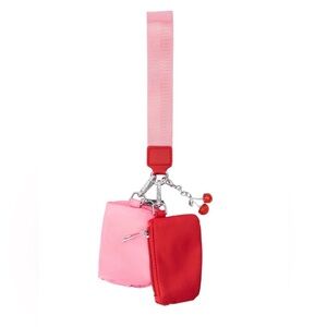 This is a dual pouch wristlet keychain wallet in pink and red nylon with a cute cherry bag charm!