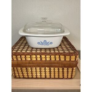 This vintage rare 60s Corning Ware Cornflower Blue 5 Qt. Dutch Oven P-34-B with Lid is a collectible piece of decorative cookware from the 1960s. Made of glass and ceramic using pressed glass production technique, this square Dutch oven features a beautiful blue color with a ceramic surface coating. The Corning Ware product line is known for its quality and durability, making this piece a valuable addition to any vintage kitchen collection.
