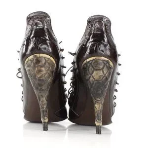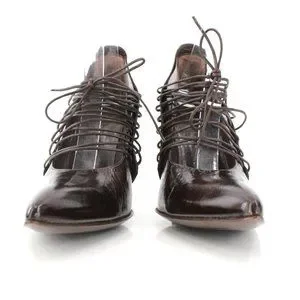 Gianni Barbato shoes, patent leather lace up pumps, pointed toe heels, sculptural heel pumps, brown designer heels, handmade Italian shoes, avant footwear