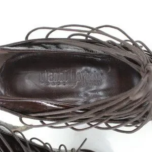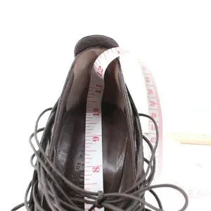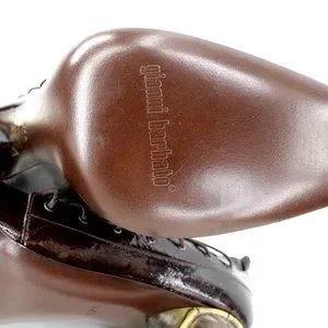 New without box Gianni Barbato lace-up pumps crafted from genuine patent leather with a deep chocolate brown finish. These are true patent leather, not coated or plastic-feeling. Sharp pointed toe with a long lace-up vamp that can be adjusted higher or lower depending on fit and preference.