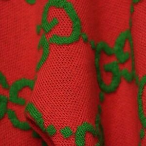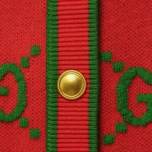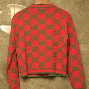 Stylish Gucci jacket with iconic logo pattern. Features pink base with green accents. Gold buttons add elegance. Perfect for any occasion.