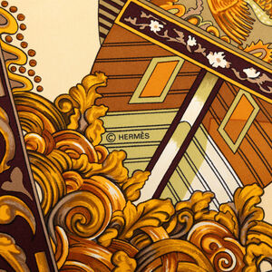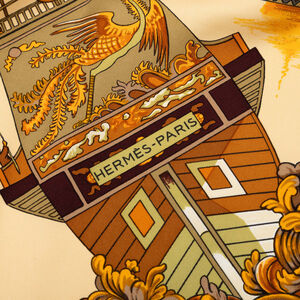 This scarf features the Jonques Et Sampans print on 100% silk. It carries an AB condition rating.