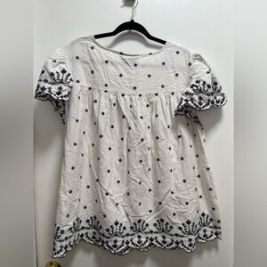 Elevate your wardrobe with this elegant Lane Bryant top. Featuring a classic white base adorned with intricate black embroidery, this top is perfect for any occasion. Enjoy the comfort and style that Lane Bryant is known for.