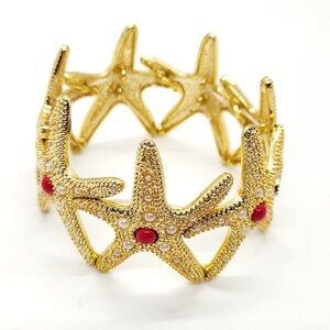 Elegant gold starfish bracelet featuring striking red accents. Perfect for adding a touch of ocean-inspired glamour to any outfit.
