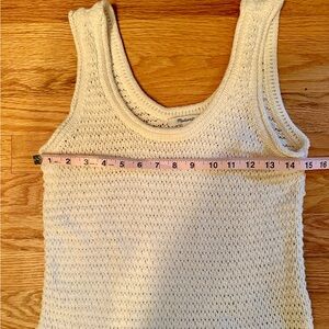 Elevate your basics with this beautiful boho Madewell textured knit tank. Featuring a breathable open-stitch design and a soft ivory/cream hue, this top is the perfect blend of cozy and breezy. It features a flattering scoop neckline, wide straps, and a chic ribbed hem with side slit details for added movement.