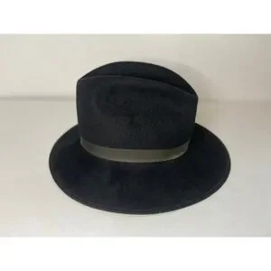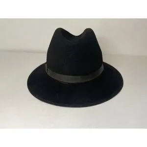 Discover timeless sophistication with this classic black fedora hat. Crafted from 100 percent wool, this hat offers a refined texture and enduring quality. The deep black hue is elegantly complemented by a subtle brown band, adding a touch of understated charm. Its structured brim and indented crown provide a distinguished silhouette, perfect for elevating any ensemble. Ideal for a stylish day out, a sophisticated event, or simply adding a polished finish to your everyday look.