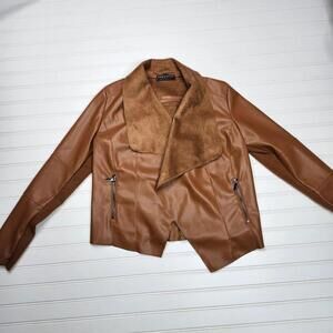 Faux leather brown/camel colored Bagatelle waterfall jacket. So cute! has stretch fabric along underside of the arms so the jacket has a comfortable degree of stretch.
