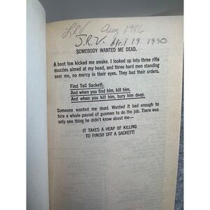 This Louis L'Amour softcover book shows signs of wear and use but is in good, readable condition. The front page of the book has writing, and the bottom portion of the spine has tearing.