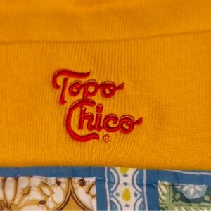 Topo Chico OS knit hat. Solid yellow-ish gold with red stitching across front. Soft as a cloud, thick enough to keep the dome warm, yet comfy for all day wear. No tags, but never worn, in new condition.