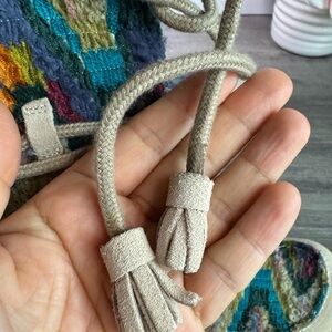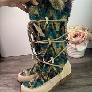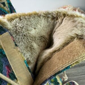 Unique boots in excellent like new condition. Velcro side closure. Beautiful woven colors on the 15” tall boots. Soles unworn. Smoke free pet free home. Fur interior. Super warm.
