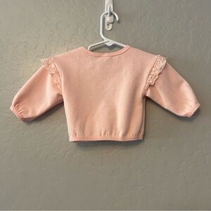 Light pink long sleeve sweatshirt with embroidered images of minnie mouse, daisy duck and figaro the cat. Has eyelet lace ruffles on shoulders and functional buttons on left shoulder