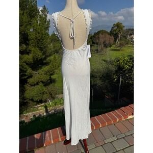 Keywords: slip dress, maxi dress, lace trim, square neck, back tie, white dress, summer dress, beach dress, wedding guest, feminine, elegant, resort wear, boho