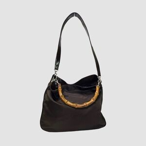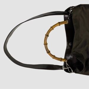 Keywords: Gucci, hobo bag, bamboo strap, black handbag, women's fashion, 90s bag, medium size, nylon leather, shoulder bag, pre-owned, authentic branding, versatile style, city chic, elegant design, Italian craftsmanship.