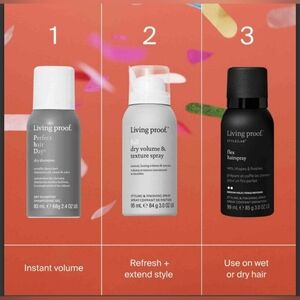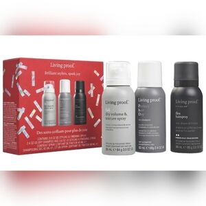 Tame frizzy hair with the Living Proof Frizz Shampoo and Conditioner. This duo is perfect for smooth, manageable hair and, 3 finishing products, travel size dry shampoo, volume texture spray & flex hairspray. All new.
