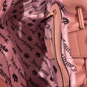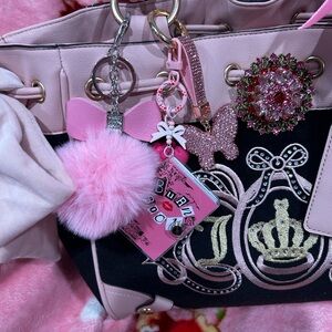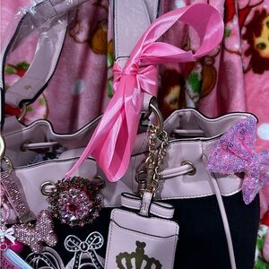 Chic Juicy Couture tote in pink and liquorice black. Adorned with crown motifs and playful charms - brand new bag - without tags - tag was cut off accidentally- the bag was never used - I added purse charms, bows & a pin - all are removable so you can keep the bag the way it is or change it up whichever way you want for variety & fun - smoke free home - thank you gift included with purchase