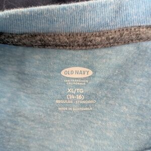 Baby Blue Bundle, boys XL/14-16. Old Navy, heathered/ short sleeve tee (18' pit to pit, 17' across hem, 25' length), crewneck, super soft, rib knit. Urban Pipeline The Awesomely Soft Ultimate Tee, Raglan style (18.5' pit to pit, 24' length), ribbed edging, contrasting blues, crewneck, long sleeve.