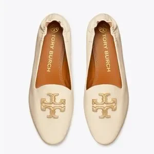 Chic cream flats featuring a gold Tory Burch logo. Perfect blend of style and comfort.