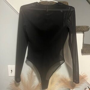 Chic black bodysuit with sheer long sleeves. Round neckline and snap closure. Pre-loved in excellent condition.