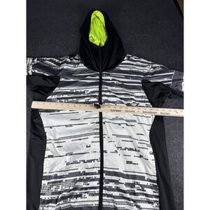 Color/Pattern: Black and white with digital/abstract line print, black panels, bright yellow mesh hood lining