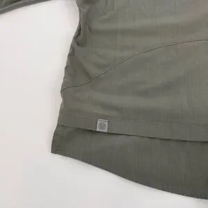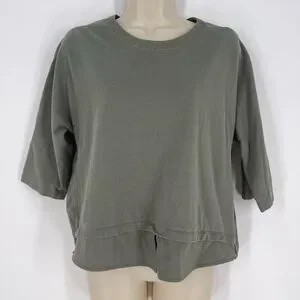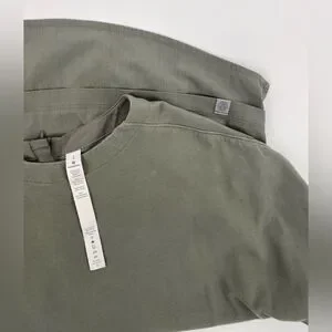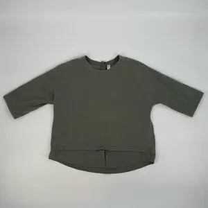 Army green light Lululemon 3/4 length sleeve top. Zips up the back. Has the Lulu symbol on the back bottom. Front panel of the shirt is made of cotton. Body is mostly polyester. Size 2, pull tag still in tact. Two small oil spots on the front, shown in picture.