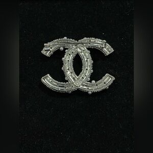 Elegant brooch with pearl embellishments. Features classic interlocking design in silver.