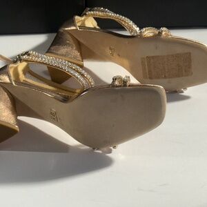 These show-stoppers boast a substantial block heel that effortlessly balances style and stability. Wrapped in a satin or metallic sheen that catches the light, these sandals feature twinkling crystal-adorned straps over the toes and around the ankle, transforming every step into a sparkling statement.