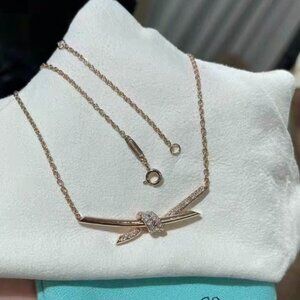 This elegant Tiffany & Co. necklace features a delicate knot pendant, symbolizing unity and strength. Crafted in lustrous rose gold with sparkling diamond accents, it adds a touch of sophistication to any outfit, making it perfect for both everyday wear and special occasions.
