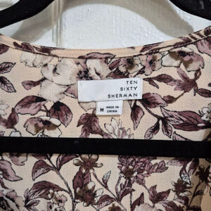 This new with tags Women's Ten Sixty Sherman midi dress, size M, features a beige background with a brown and purple floral and leaf pattern. It has ruffle sleeves, a V-neck wrap-style bodice, and a tie-waist. The dress is made from 95% polyester and 5% spandex, offering a flowing silhouette with a high-low hem. Visible measurements indicate an approximate 16-inch bust (flat) and 44-inch length from shoulder to hem. A Nordstrom tag is attached.