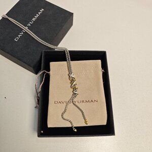 This exquisite David Yurman necklace from the X Collection features sterling silver chains intertwined with elegant 18k yellow gold X pendants, adorned with sparkling pavé diamonds. A perfect blend of modern design and timeless elegance, this necklace adds a luxurious touch to any ensemble.