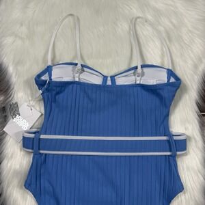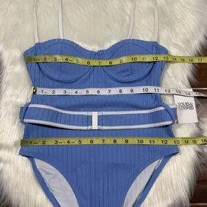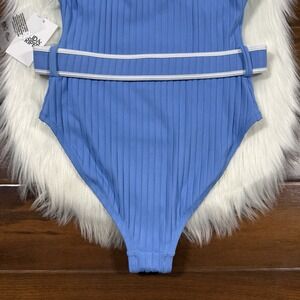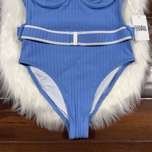 Solid & Striped Women's Size Small Marina Blue Ribbed The Spencer Belted One Piece Swimsuit, 92% Recycled Polyamide 8% Spandex, Stretch, Adjustable Spaghetti Straps, Underwire, Removable Bra Pads, Removable Belt