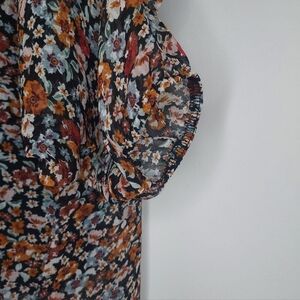 Black lined bodice with flowy outer floral layer, shirred upper yoke and relaxed fit.