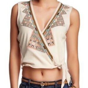 Chic sleeveless top featuring intricate embroidery. Perfect for a stylish, casual look.