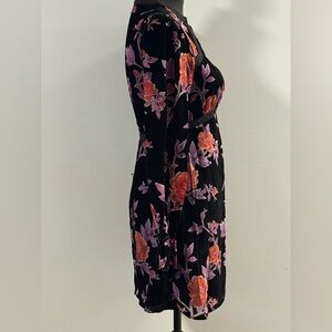 Chic black dress with vibrant floral design. Long sleeves and stylish cutouts. Perfect for any event. Euc!