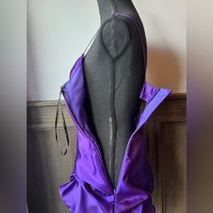 Elegant purple mini dress with satin texture. Features a ruched skirt and thin straps. Ideal for special occasions. This dress is stunning! The material is so luxurious and the beading is gorgeous! Size 5. Does have a small spot on the back. I haven’t tried getting it out. Pictured.
