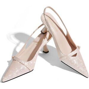 Elegant Low Heel Dress Shoes: Pointed toe with pearl and strap details adds a touch of sophistication and refined charm. These elements of the low heel pumps perfect for elevating your outfit with grace. Slingback Pumps: The Slingback design ensures a comfortable and effortless wear. The kitten pumps keeps every step steady, whether on a busy day or a casual stroll. Comfortable Low Heel: With a modest 2.56 inch heel, the work heels provide excellent support and long time comfort. Patent Leather Heels: Made from high-quality patent faux leather, enhancing visual appeal and offering lasting elegance and durability. Versatile for Any Occasion: The classic slip on pumps easily pair with dresses, skirts, or pants, etc. perfect for the office, party, wedding, shopping, casual or formal events.