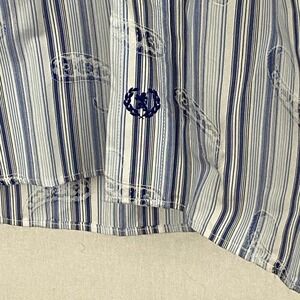 Description: white with shades of blue stripes, white embroidered paisley pattern over stripes, left chest pocket, flip cuffs and contrasting inner collar band